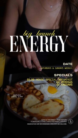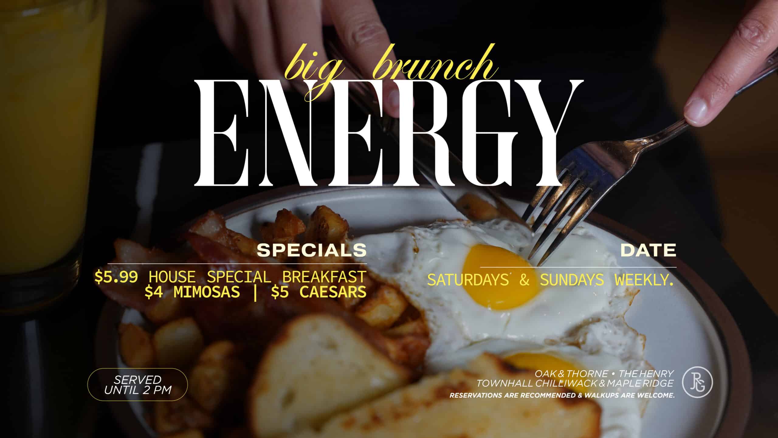 Join us for a Big Brunch Energy every Saturday & Sunday served until 2PM. Gather your friends and family and make a reservation at Oak & Thorne, The Henry, Townhall Chilliwack & Maple Ridge for a brunch experience perfect for the whole family.